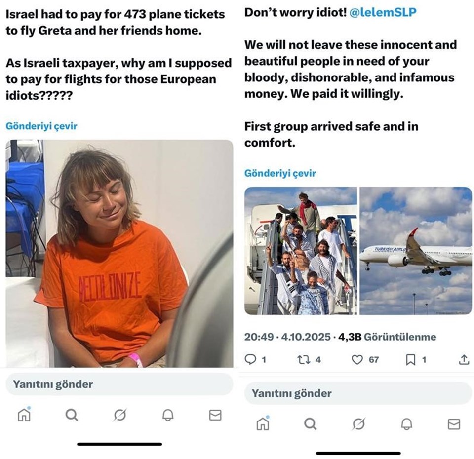 İsrail yanlısı hesaplar Greta Thunberg’in fotosuyla, aktivistlerin geri dönüş uçak biletlerini gündeme getirmeye çalışıyor. (Soldaki foto) Bu paylaşıma binlerce tepki yağdı ve bazı paylaşımcılar (sağdaki foto) Türkiye’nin de desteğini hatırlattı,  gönüllü yardımının altını çizdi.