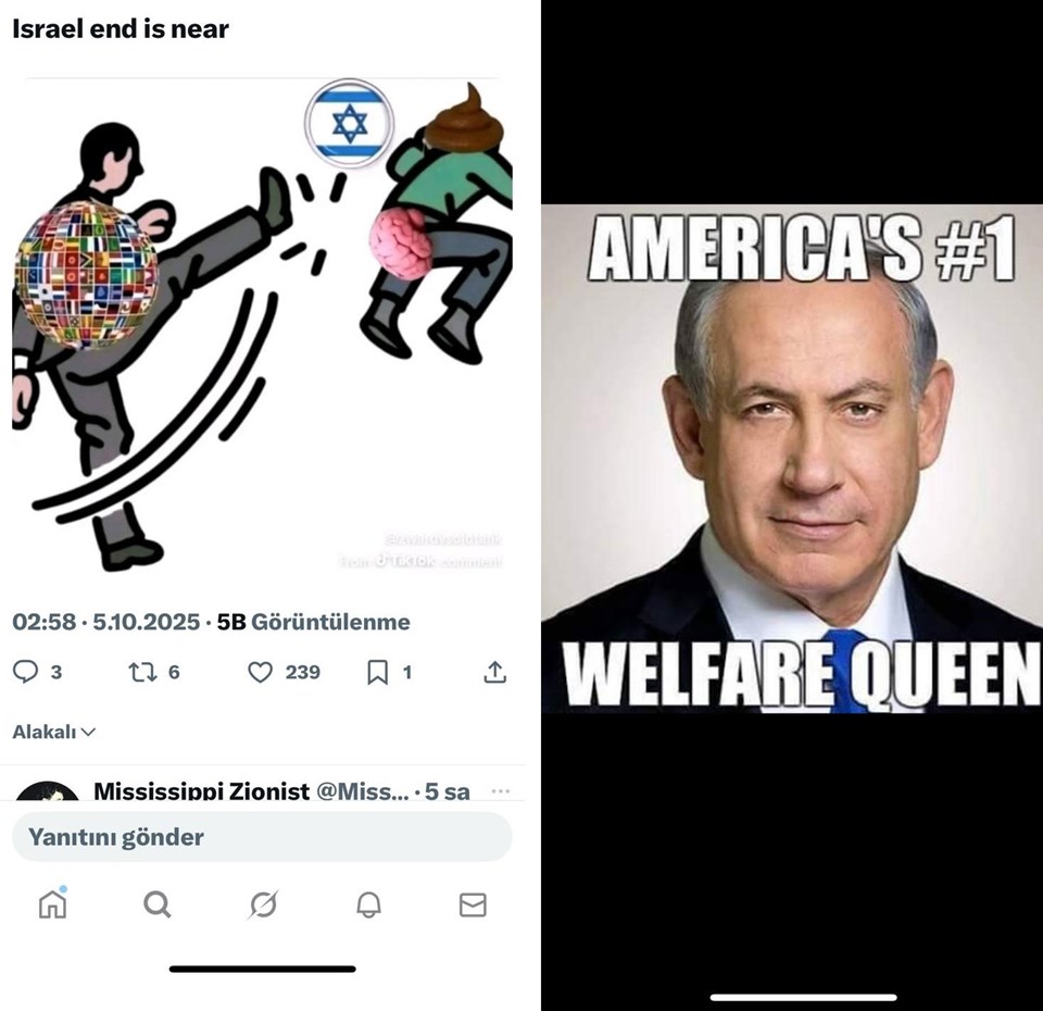 20 milyon etkileşim yaratan paylaşımda, binlerce ABD’li, İsraillilere, vergileriyle ayakta kaldıklarını hatırlatıyor. İsrail Başbakanı Binyamin Netanyahu için, ABD’de sosyal yardımları istismar edenler için kullanılan “Refah Kraliçesi” nitelemesi yapılıyor.